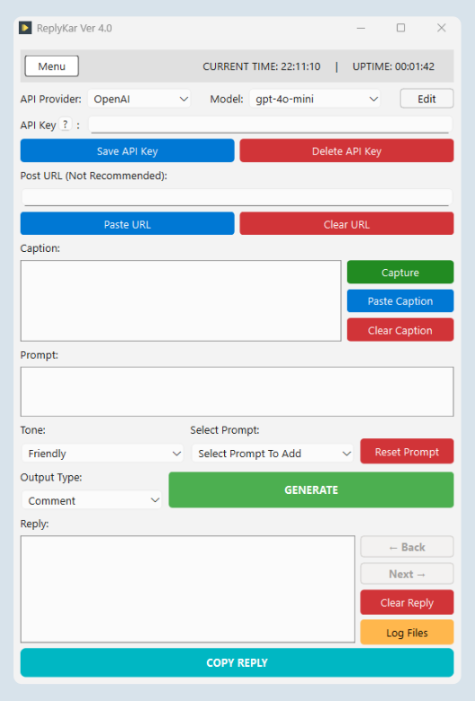 ReplyKar helps you craft quick, natural, and engaging comments and replies for any social media post. Whether on Instagram, Threads, or other platforms, it turns your ideas into smart, human-like messages in seconds. It pulls captions automatically, supports multiple AI models, and lets you customize tone and style—all in a fast, clean desktop app. Save time, stay active online, and keep every comment or reply personal with ReplyKar.